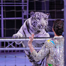 Величественные и безупречные белоснежные и золотые бенгальские тигры! Под магическим контролем виртуозов Инны Забелкиной и Романа Гармаша эти грозные властелины джунглей исполняют головокружительные пируэты, оставаясь удивительно нежными. Рядом с ними — экзотические гости из Африки, Индии и Мадагаскара, создавая настоящий карнавал дикой природы!